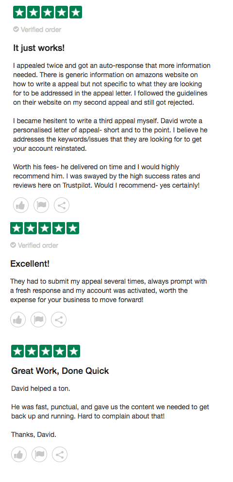 Backed by years of trusted experience, we provide custom-written appeal letters tailored to your exact suspension circumstances, along with a detailed plan of action required by Amazon. With us, there are no hidden fees – if a second appeal letter is needed, you won’t be charged. Our proven track record allows us to restore seller accounts, even if previous appeals have been rejected by Amazon.